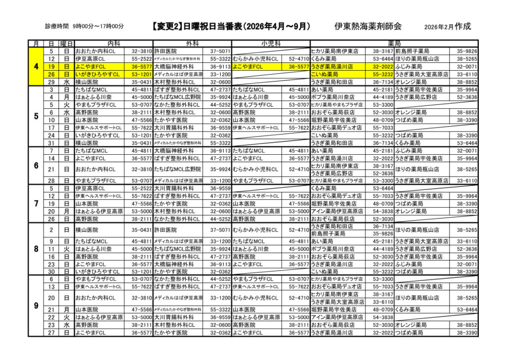 日曜祝日当番表 2026.4.9
